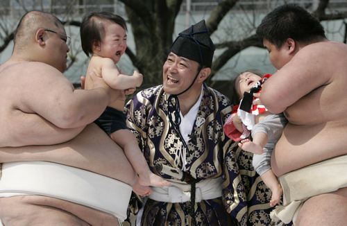 Babies, held by amateur sumo wrestlers, cry loudly during a baby-crying contest at Sensoji temple in Tokyo April 28, 2007. Eighty-four babies born in 2006 took part in the event, which is held to pray for the babies' health and growth. The winner of the contest is the baby who cries the loudest.