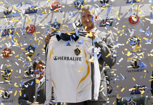 Updated: 2007-12-04 17:36 ![]() Britain's David Beckham smiles as he holds his new team jersey during an LA Galaxy news conference introducing him as the newest member of the MLS soccer league team in Carson, California, July 13, 2007.