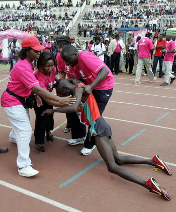 Updated: 2007-12-04 17:36 ![]() Kenya's Olympics champion Ezekiel Kemboi Yano receives help after crossing the finish line to win the men's 3,000 metres steeplechase final at Nyayo National Stadium in Nairobi July 28, 2007.