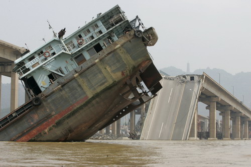 Updated: 2007-12-05 10:24 ![]() A general view shows the collapsed section of Jiujiang Bridge after it was hit by a sand-laden boat in South China's Guangdong Province June 15, 2007. The mile-long road bridge packed with cars and trucks collapsed early on Friday after being hit by a boat laden with sand, leaving part of the highway leading directly into the sea.