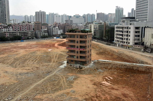A six-floor villa is viewed on the construction site in the central business district of Shenzhen, Guangdong Province of South China, April 17, 2007. Choi Chu Cheung, the owner of the villa, and his wife Zhang Lian-hao, refused to accept the compensation offered by the developer who plans to build a financial centre on the site. The couple are demanding that the developer compensate them with property similar in size or raise the offer from 6,500 yuan ($840) to 18,000 yuan ($2,327) per square metre.