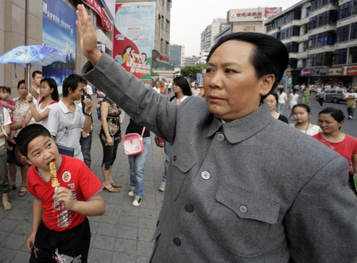 Chen Yan (R), a 51-year-old Chinese female impersonator of China's late Chairman Mao, waves to the crowd during a photocall in Mianyang in Southwest China's Sichuan Province May 26, 2007. Chen, measuring 1.55 metres (5.1 feet) tall, was discovered by a beautician during a local TV show. She has to wear a pair of specially designed platform shoes to increase her height to 1.80 metres (5.9 feet). Chen is said to be the first woman to impersonate the former Chinese leader.