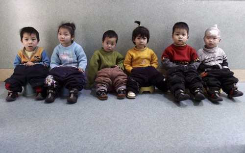 Children use the toilet at a welfare house in Shenyang, Northeast China's Liaoning Province January 27, 2007. The welfare house houses about 140 abandoned children, many of whom are disabled.