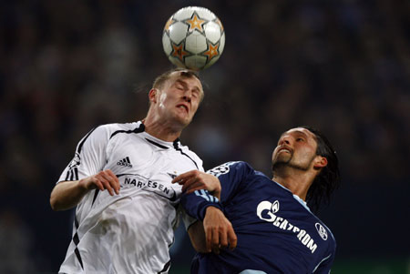 Schalke 04's Kevin Kuranyi (R) jumps for the ball with Rosenborg's Frederik Sroor during their Champions League Group B soccer match in Gelsenkirchen December 11, 2007. [Agencies]