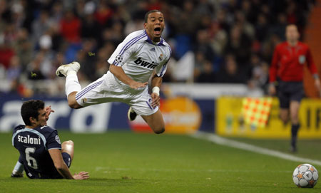 Real Madrid's Marcelo (R) is tackled by Lazio's Lionel Scaloni during their Champions League Group C soccer match at Santiago Bernabeu stadium in Madrid December 11, 2007. [Agencies]