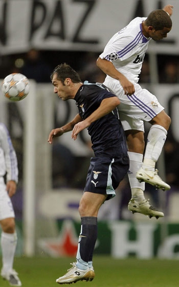 Lazio's Goran Pandev (L) and Real Madrid's Marcelo battle for the ball during their Champions League Group C soccer match at Santiago Bernabeu stadium in Madrid December 11, 2007. [Agencies]