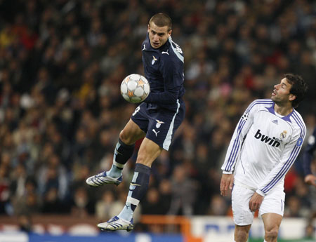 Real Madrid's Ruud van Nistelrooy (R) and Lazio's Lorenzo de Silvestri fight for the ball during their Champions League Group C soccer match at Santiago Bernabeu stadium in Madrid December 11, 2007. [Agencies]