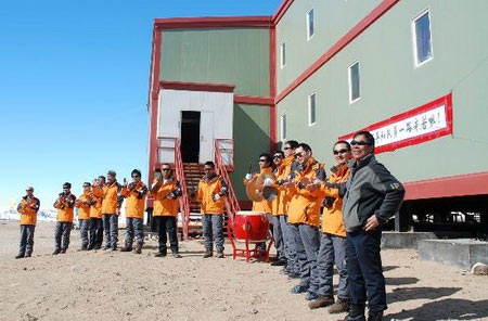Members of Zhongshan Station, China's scientific research center on Antarctica, line up to welcome the Xuelong icebreaker, which is here for the country's 24th trip to the South Pole, December 11, 2007. [Xinhua]