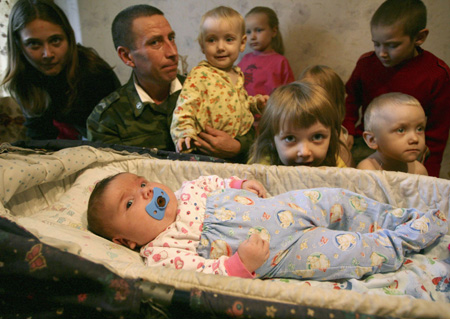 Nadia Khalina, possibly the world's fattest baby, lies in a pram next to her father Viktor (2nd L) as her brothers and sisters look on in their apartment in the Siberian city of Aleisk October 26, 2007. Tatyana Khalina gave birth on September 17 to Nadia, who weighed a whopping 7.75 kg (17.1 lb) at birth. The heaviest baby ever born weighed 10.8 kg in the United States in 1879 but it died within 11 days. The latest edition of the Guinness Book of Records notes a Brazilian baby born this year weighed 7.57 kg. Nadia was heavier. [Agencies]