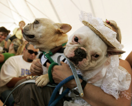 Updated: 2007-12-13 17:19 ![]() A bulldog "couple" listens to the vows during an attempt to break the Guinness record for the largest mass dog "wedding", in Littleton, Colorado May 19, 2007. Fifty dog "couples" were married on Saturday, surpassing the previous record of 26 set in the Netherlands. [Agencies]