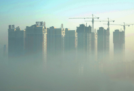 Updated: 2007-12-14 15:50 ![]() Residential towers and construction cranes are half seen amid dense fog in Shenyang, Northeast China's Liaoning Province, December 14, 2007. Fog has haunted the industrial city for days due to the cold air and troubled road traffic. [Xinhua]