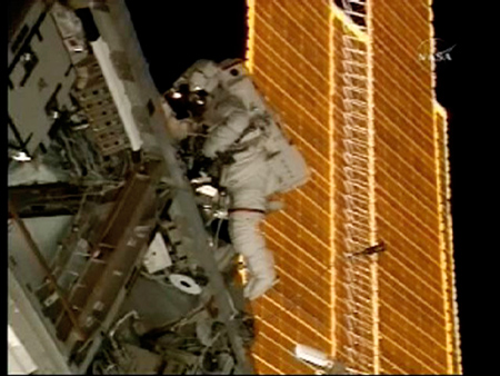 Updated: 2007-12-19 10:56 ![]() International Space Station (ISS) Commander Peggy Whitson works on electrical and fluid connections during a spacewalk from the ISS in this image from NASA TV November 24, 2007. [Xinhua]