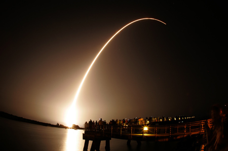 A long-exposure photograph shows the Phoenix Mars explorer blasts off from Kennedy Space Center in Cape Canaveral, Florida, August 4, 2007. [Xinhua]