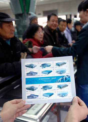 Stamp collectors are at a Beijing post office to buy the newly issued commemorative stamps featuring some of the sports venues that will host the 2008 Olympics Games, December 20, 2007. [Xinhua]
