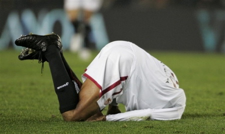 Sevilla's atttacker Frederic Kanoute falls down in a game against Villarreal, Jan. 20, 2007.