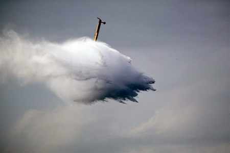 A plane drops water to woods in flames, July 25, 2007. The southeast Europe wrapped by heat waves became very combustible.