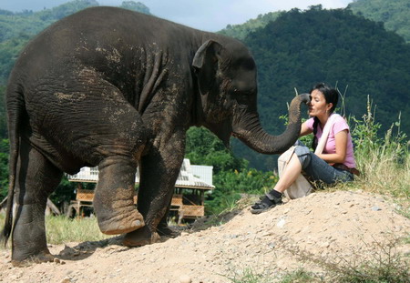 Sangduen "Lek" Chailert plays with ex-working elephants at her rescue centre for domesticated elephants in Chiang Mai, northern Thailand on November 19. 2007. Elephant conservationists such as Chailert worry that captive elephants, considered beasts of burden in Thailand, have little protection from abuse if their owners work them all day to bring in more tourist dollars. [Agencies]