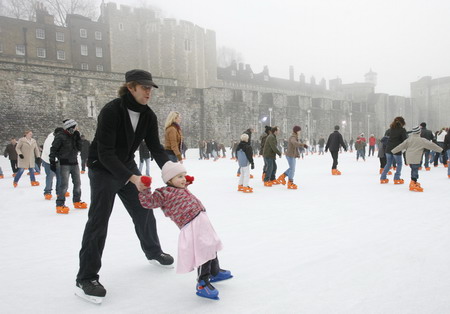 Skaters are seen through mist using the ice rink at the Tower of London December 23, 2007. [Agencies]