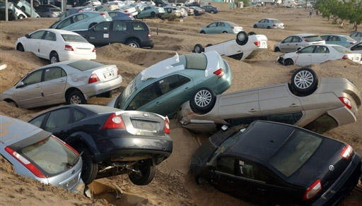 New cars of a car selling company in Muscat, Oman are buried in sand on June 11 after a hurricane swept the area.