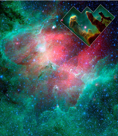 Supernova destroys "Pillars of Creation." In a thousand years, astronomers predicted in January, people on Earth will see the iconic "Pillars of Creation" get toppled by a supernova, the explosive death of a giant star. The pillars are dense clouds of gas in the Eagle Nebula, a star nursery in the constellation Serpens, near Sagittarius. They were made famous by a dramatic 1995 Hubble Space Telescope image (inset).
