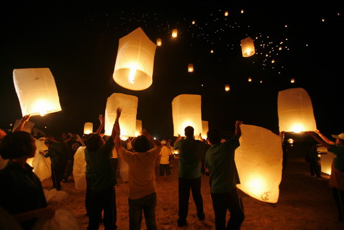 Updated: 2007-12-27 17:20 ![]() Floating paper lanterns fill the sky over the Andaman Sea in remembrance of the Indian Ocean tsunami victims in Khao Lak, in Thailand's Phang Nga province, nearly 110 km (68 miles) north of the resort island of Phuket, December 26, 2007. The Indian Ocean tsunami on December 26, 2004 killed almost 6,000 people and left nearly 3,000 missing in Thailand. [Agencies]