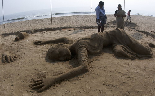 An artist sprays water on a sand sculpture at Marina beach to commemorate the third anniversary of the Indian Ocean tsunami in the southern Indian city of Chennai December 26, 2007. More than 3,500 people were killed on the islands and nearly 9,000 people were killed on the mainland, mostly in the southern state of Tamil Nadu. [Agencies]