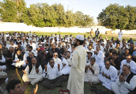 Supporters of assassinated Pakistani opposition leader Benazir Bhutto pray during a gathering to mourn her death in Dubai December 28, 2007. [Agencies]