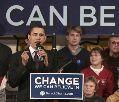 U.S. Democratic presidential candidate Senator Barack Obama (D-IL) campaigns at Stevens High School in Claremont, New Hampshire January 7, 2008. New polls showed him jumping into the lead ahead of Hillary Clinton. [Agencies]