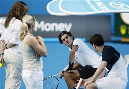 Defending champion Roger Federer of Switzerland, center, talks to his supporters during a practice session at Rod Laver Arena as he prepares for the Australian Open tennis championship in Melbourne, Australia,Thursday, Jan. 10, 2008. The season's opening Grand Slam event begins here on Monday Jan 14. [Agencies]