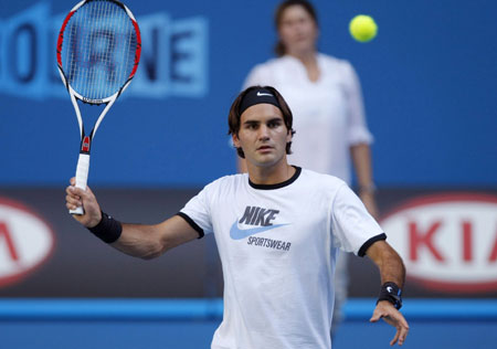 Switzerland's Roger Federer practises at Melbourne Park January 10, 2008 ahead of the Australian Open tennis tournament, which begins on Monday. [Agencies]