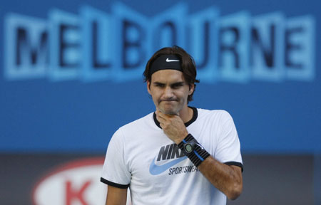 Switzerland's Roger Federer holds his throat during a practice session at Melbourne Park January 10, 2008 ahead of the Australian Open tennis tournament, which begins on Monday. [Agencies]