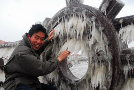 Updated: 2008-01-14 10:08 ![]() A man touches icicles hanging from a metal wheel on the coast of Yantai, East China's Shandong Province, January 13, 2008. The icicles were formed when strong winds pushed sea water to the shore, as temperatures fell to minus five degrees Celsius. [Xinhua]