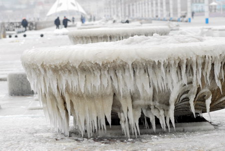 Updated: 2008-01-14 10:08 ![]() Icicles hang from stones along the sea in Yantai, East China's Shandong Province, January 13, 2008. The icicles were formed when strong winds pushed sea water to the shore, as temperatures fell to minus five degrees Celsius. [Xinhua]