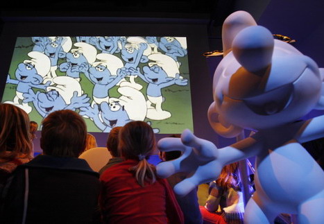 Children watch a cartoon of the Smurfs at the start of a news conference in Brussels January 14, 2008. It is the Smurfs' 50th anniversary this year. [Agencies]