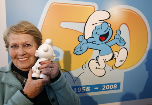 Nine Culliford, the widow of cartoonist Pierre "Peyo" Culliford who created the Smurfs, poses after a news conference in Brussels January 14, 2008. The Smurfs celebrated their 50th anniversary this year. [Agencies]