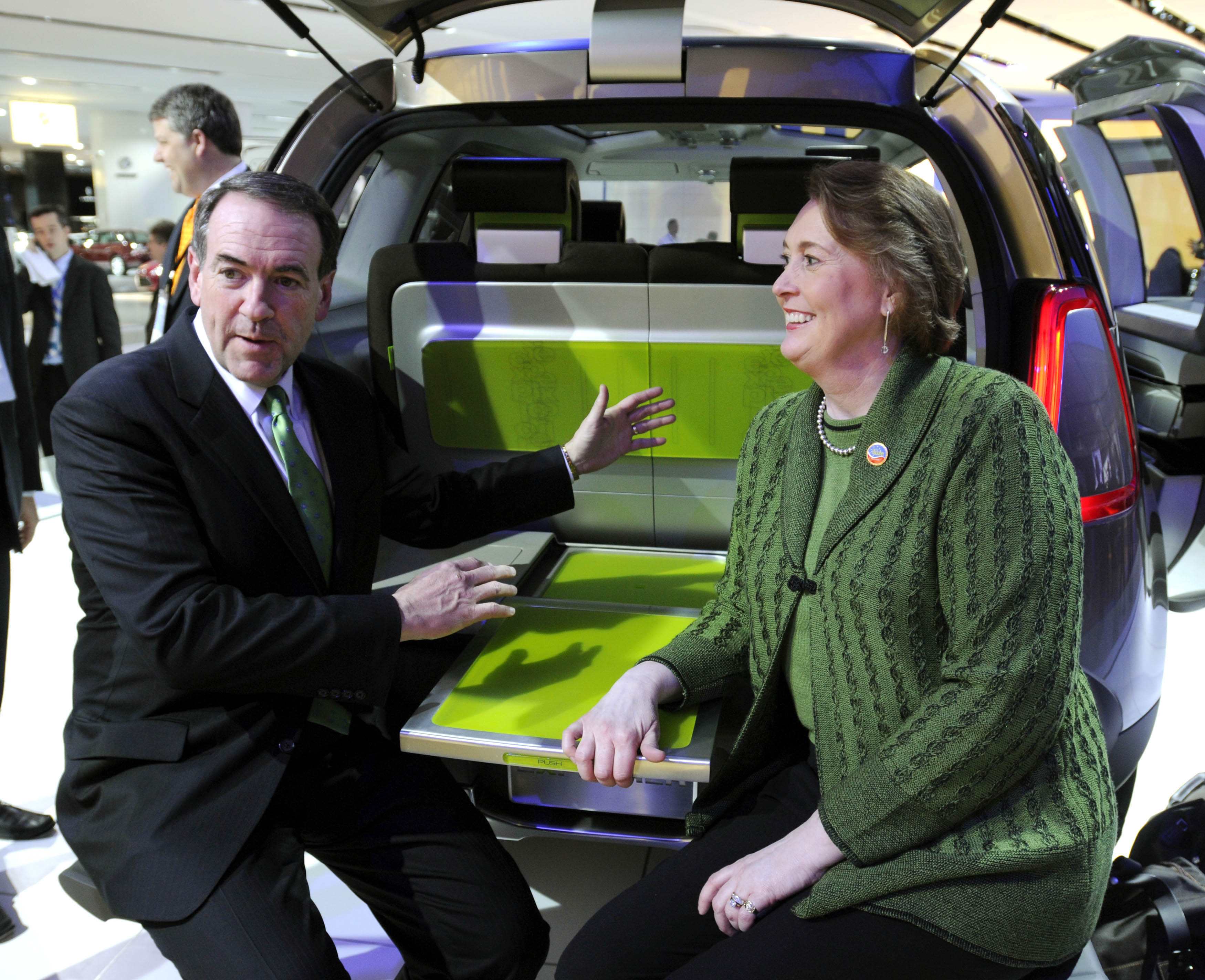 US Republican presidential candidate Mike Huckabee and his wife Janet sit in the rear of a Ford Explorer America concept vehicle while touring the 2008 North American International Auto Show in Detroit, Michigan January 14, 2008. [Agencies]