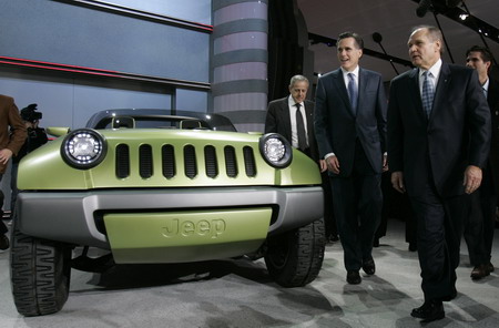Updated: 2008-01-15 16:49 ![]() Republican presidential candidate Mitt Romney (C) tours the Chrysler exhibit with Chrysler CEO Bob Nardelli (R) during press days of the 2008 North American International Auto Show in Detroit, Michigan January 14, 2008. [Agencies]