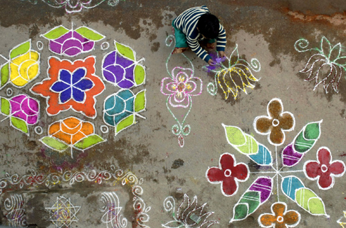 Updated: 2008-01-16 09:22 ![]() A child makes a Rangoli, a traditional pattern made from coloured powders, during the religious Hindu festival of "Makar Sankranti" which marks the start of spring, in the southern Indian city of Hyderabad January 15, 2008. [Agencies]