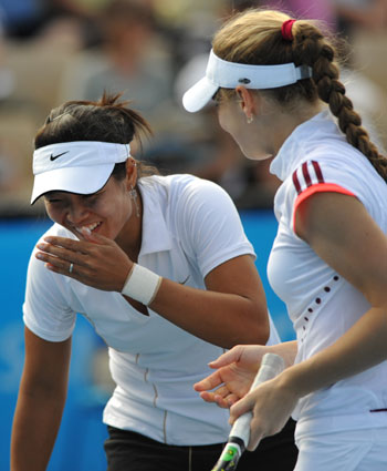 China's Li Na (L) jokes with partner Anna Chakvetadze from Russia during the first round women's doubles game against Li's compatriots Peng Shuai and Sun Tiantian at the Australian Open tennis tournament in Melbourne January 16, 2008. The Chinese pair won 2-1. [Xinhua]