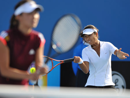 China's Peng Shuai (L) and Sun Tiantian hit a shot to compatriot Li Na and Anna Chakvetadze from Russia during their first round women's doubles game at the Australian Open tennis tournament in Melbourne January 16, 2008. The Chinese pair won 2-1. [Xinhua]