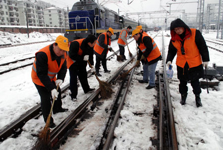 Workers sweep the snow at Hefei Railway Station of Anhui Province on Sunday January 20, 2008. The provincal meteorological authority on Sunday issued an orange alert - the second-highest on a scale of five - for heavy snow during the next few days. [Xinhua]