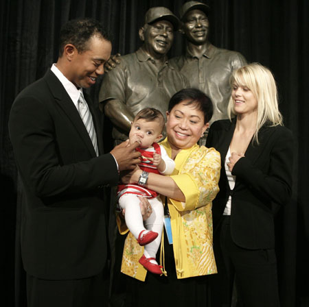 Golfer Tiger Woods (L), his daughter Sam, his mother Kultida and his wife Elin Nordegren (R) pose together in front of a bronze statue bearing the likeness of Tiger with his late father Earl during its unveiling inside the Tiger Woods Learning Center in Anaheim, California January 21, 2008. [Agencies]