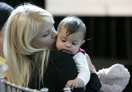 Swedish model Elin Nordegren, wife of golfer Tiger Woods, kisses their daughter Sam during a ceremony where a bronze statue bearing the likeness of Tiger with his late father Earl was unveiled inside the Tiger Woods Learning Center in Anaheim, California January 21, 2008. [Agencies]