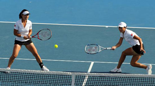 China's Yan Zi (R) hits a shot as her partner Zheng Jie looks on during their Women's Doubles fourth round match against Venus Williams and Serena Williams of the US at the Australian Open tennis tournament in Melbourne, Australia, Tuesday, Jan. 22, 2008. [Agencies]