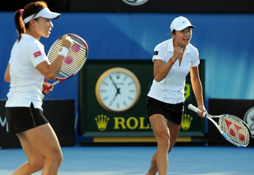 China's Yan Zi, right, and Zheng Jie , left, celebrate a point won over Venus Williams and Serena Williams of the US in their Women's Doubles fourth round match at the Australian Open tennis tournament in Melbourne, Australia, Tuesday, Jan. 22, 2008. [Agencies]