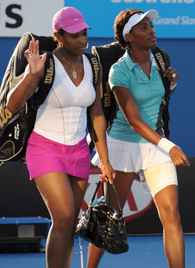 Venus Williams of the US, right, and her sister Serena leave the court after their Women's Doubles fourth round loss to China's Yan Zi and Zheng Jie at the Australian Open tennis tournament in Melbourne, Australia, Tuesday, Jan. 22, 2008. [Agencies]