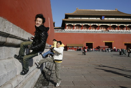 Members of the Beijing Du Yize Parkour Club show their skills at the Forbidden City in Beijing January 23, 2008. Parkour, "the art of moving", which involves moving from one point to another as efficiently and quickly as possible and overcoming obstacles using mainly the abilities of the human body, is practised in urban settings worldwide. [Agencies]