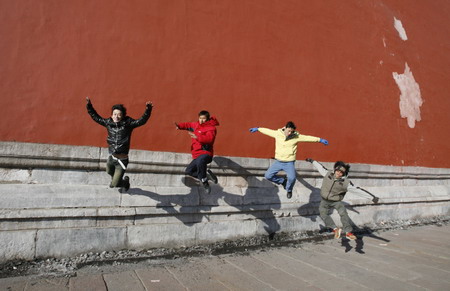 Members of the Beijing Du Yize Parkour Club show their skills at the Forbidden City in Beijing January 23, 2008. Parkour, "the art of moving", which involves moving from one point to another as efficiently and quickly as possible and overcoming obstacles using mainly the abilities of the human body, is practised in urban settings worldwide. [Agencies]