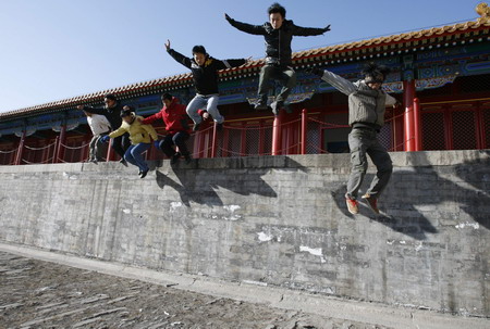Members of the Beijing Du Yize Parkour Club show their skills at the Forbidden City in Beijing January 23, 2008. Parkour, "the art of moving", which involves moving from one point to another as efficiently and quickly as possible and overcoming obstacles using mainly the abilities of the human body, is practised in urban settings worldwide. [Agencies]