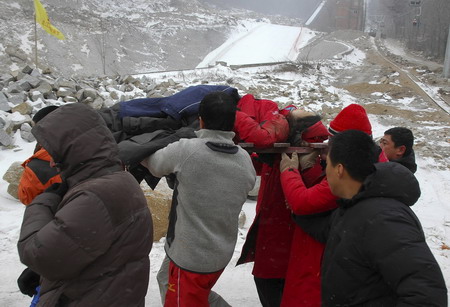 Colleagues carry broadcaster Hou Shuangmei, who has fallen five meters from a chairlift after the women's ski jumping competition at the 11th National Winter Games at Yabuli Skiing Resort in Heilongjiang Province January 23, 2008. Hou was badly injured in the accident. [Xinhua]